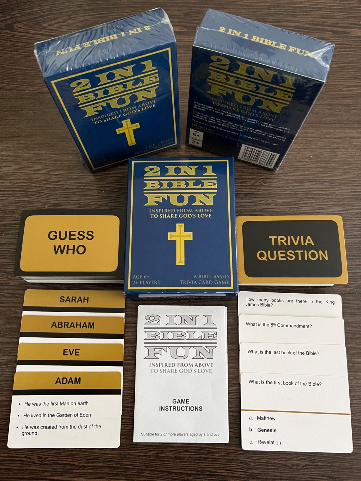 2 IN 1 BIBLE FUN is a Bible Based Trivia Card Game. Regardless of how much, or even how little, you currently know about the bible, you can either test your current knowledge, or learn as you play! 2 IN 1 BIBLE FUN is a competitive game, suitable for friend or family gatherings, and is great fun for both adults and children.